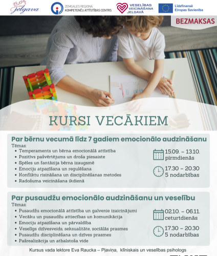 Zemgales reģiona kompetenču attīstības centrs (ZRKAC) aicina vecākus piedalīties bezmaksas kursos par bērnu un pusaudžu emocionālo audzināšanu un veselību. Nodarbības norisināsies klātienē ZRKAC, Svētes ielā 33, Jelgavā, un tās vadīs klīniskā psiholoģe Eva Raucka – Pļaviņa.