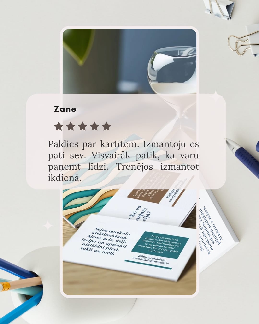 Īpaši izstrādātas kārtis, kas palīdz mazināt stresu. Tās apvieno 15 dažādas stresa mazināšanas tehnikas, kuras esmu sakārtojusi pa tematiskām grupām. Katra tehnika ir aprakstīta, lai to varētu ērti izmantot ikdienā. Kāršu komplekts ir radīts tā, lai tas būtu praktisks un viegli līdzi ņemams – tās var ievietot somiņā vai pat makā.