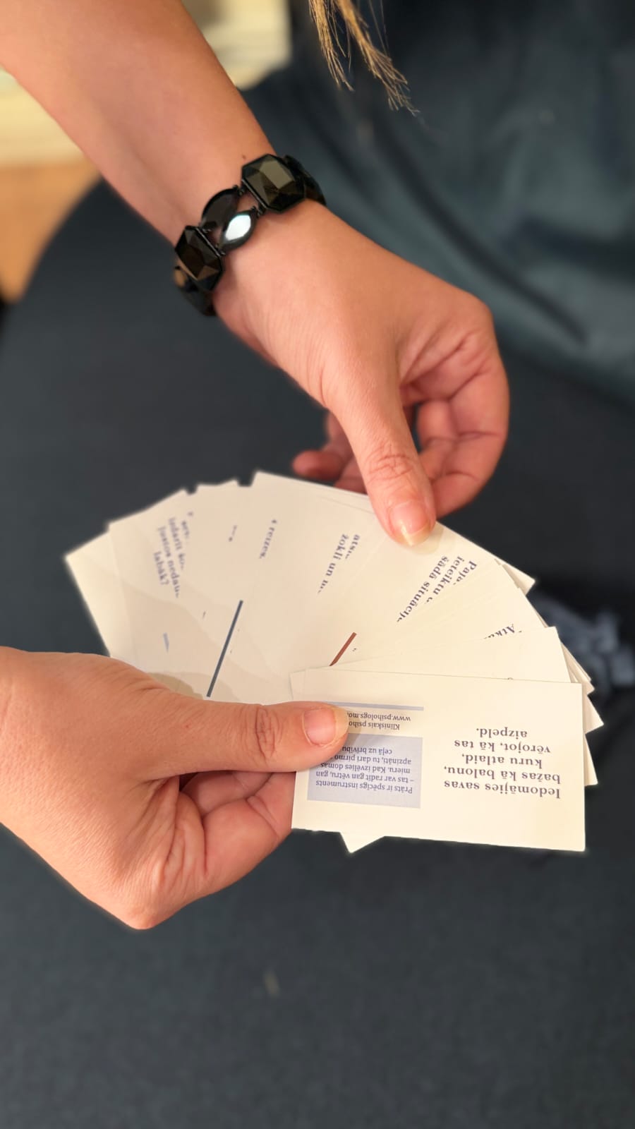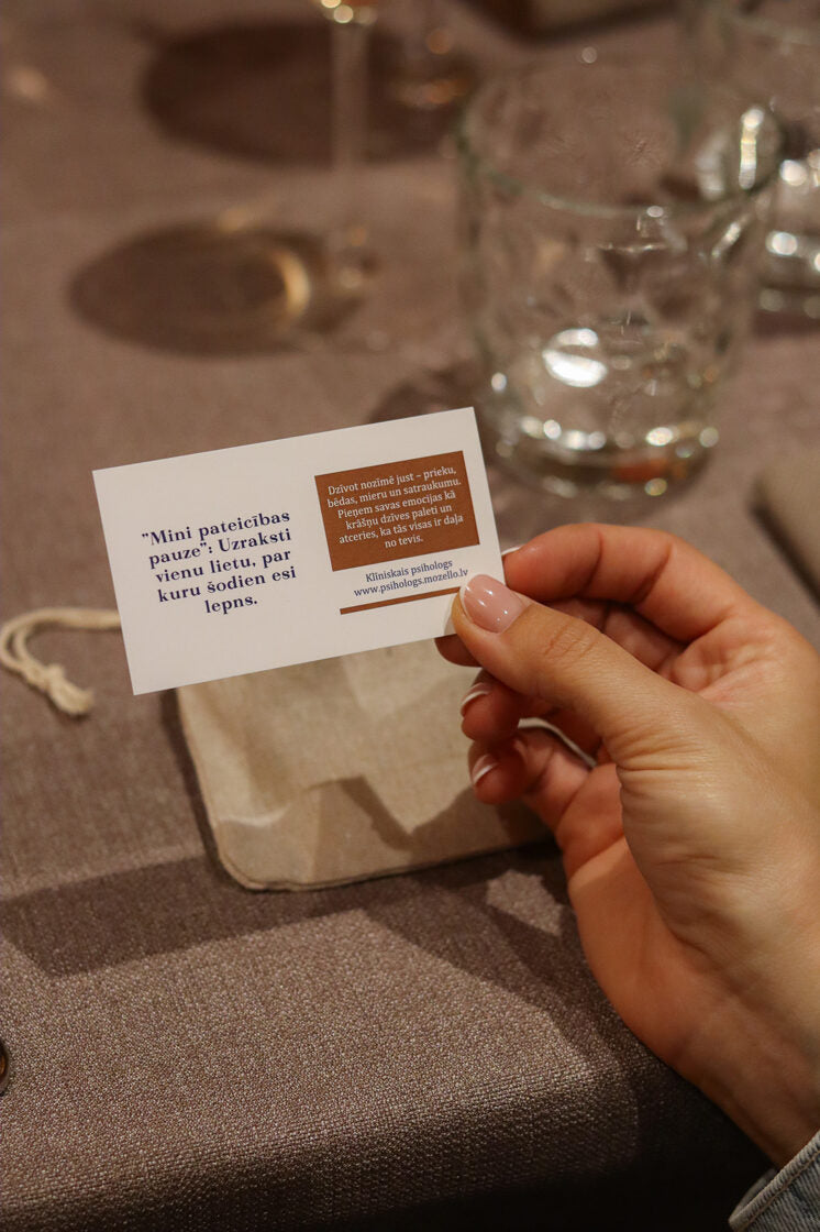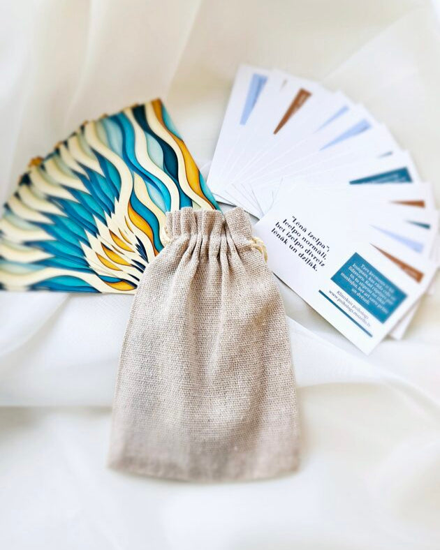 Pārdomāts Un pārbaudīts karšu dizains, izmēru un saturu, lai tās būtu maksimāli funkcionālas un piemērotas gan maniem klientiem, gan ikvienam ikdienā. Tas ir mazs lolojums, kas tapis no sirds un ir piemērots draudzenēm vai ikvienam, kuram ikdienā nākas saskarties ar stresu, uztraukumu vai pārdzīvojumiem.
